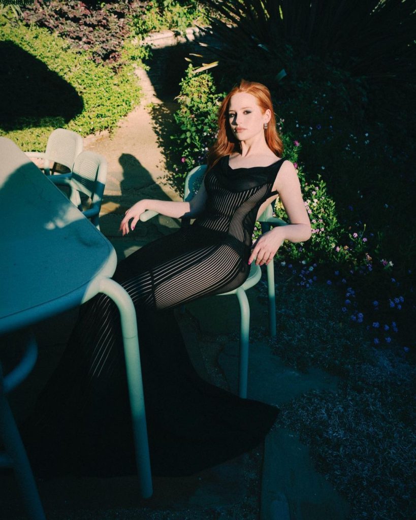 Atriz Madelaine Petsch, conhecida da série Riverdale, usa vestido transparente em evento e acaba deixando os peitinhos à mostra.